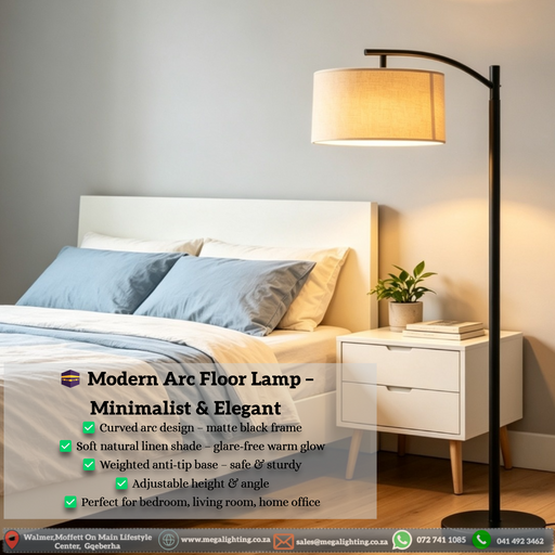 Modern Arc Floor Lamp – Minimalist Design | Soft Linen Shade | Adjustable Height | MEGA LIGHTING