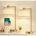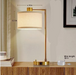 Gold Color Modern Accent Table Lamp 21' High with USB and AC Power Outlet in Base Brass White Linen Drum Shade | MEGA LIGHTING